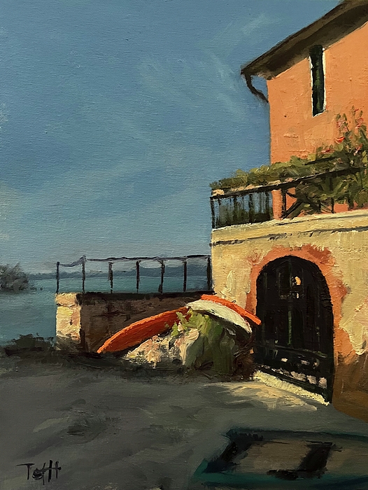 A bright peach-colored building with a balcony adorned with green plants overlooks the serene Ligurian Sea. Below the balcony, a couple of boats are... more